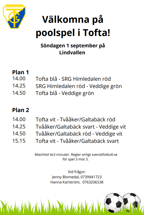 Vi byter om i Veddige och åker sedan gemensamt bort till Tofta. Det kommer vara mycket folk där då det är väldigt många lag som är med på Barnfotbollsfestivalen så det är inte säkert vi har tillgång till något omklädningsrum i Tofta.