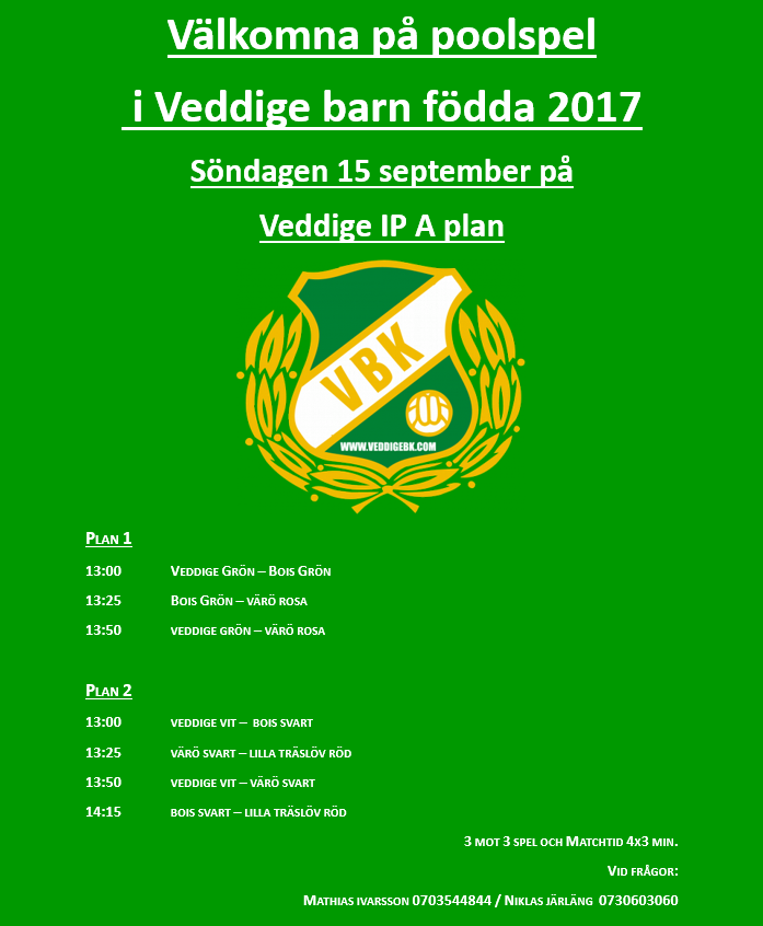 Våra lag heter Veddige Grön och Veddige Vit. Varje lag kommer att spela två matcher.